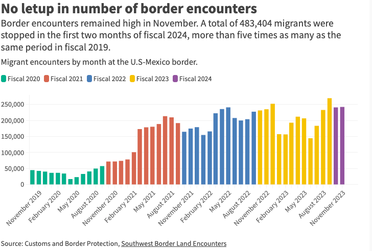 Over the course of 2023, 413,300 people scheduled appointments through the CBP One App. 327,000 of them arrived. The primary nationalities represented were Venezuelan, Mexican, Haitian, Cuban and Nicaraguan.