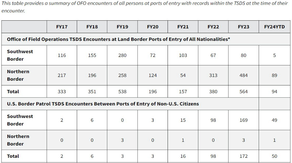 The following table shows their numbers and the region of our border with Canada and Mexico where they are coming through. Note that historically, most terrorists have been coming through Canada. We can thank WEF’er Trudeau for that. Also note the big jump in the last two years for the All Nationalities category and the big jump in 2023 along the SW border for non-US citizens.