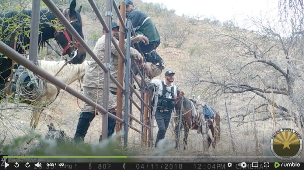The video then jumps to a guy sitting on the pipe gate dressed in civilian clothes. There is a guy who has dismounted from the white horse. The civilian guy is wearing expensive Nike running shoes. He is being preferentially treated by all present. It’s apparent he is some sort of high value client who has possibly paid a small fortune to be safely escorted across the border. Only high value targets who don’t want anyone to know where they are and what they’re doing can afford to do this. Everyone else has to travel with the rest of the “riff-raff” coming across the border. Is he a terrorist with an agenda in the US? Or is he a bigwig cartel guy who needs to get into the US to conduct drug business?