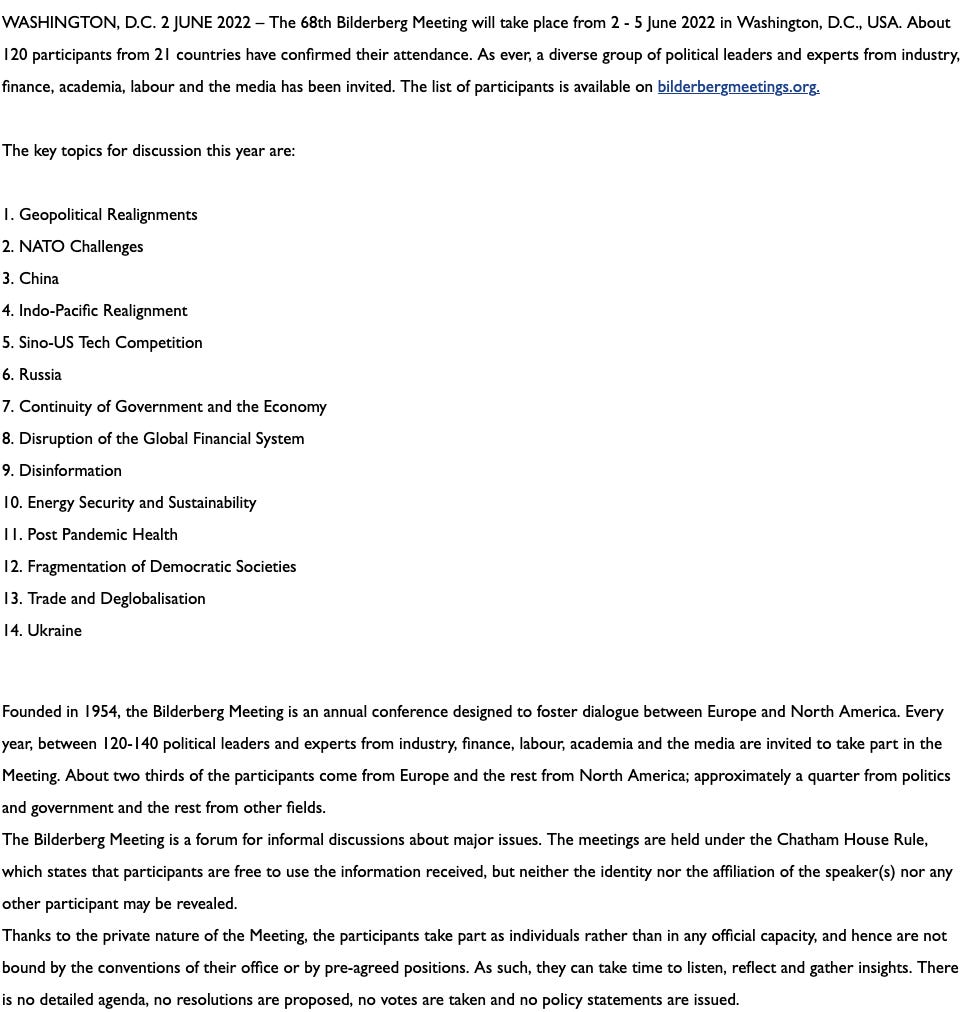 Here is the official press release from Bilderberg about this years meeting in DC.