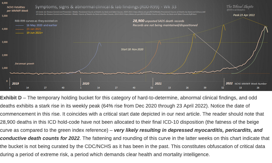 US Center for Disease Control and Prevention: Weekly Provisional Counts of Deaths by State and Select Causes, 2020-20224 (please note that the term ‘provisional’ with regard to this file only impacts the first four to six weeks of this data for the most part. The taper curve can be seen here for the August 17th 2022 drop. Don’t let anyone tell you that 2021 and 2022 data is unreliable because it is provisional – if we have an emergency we must rely upon this data)