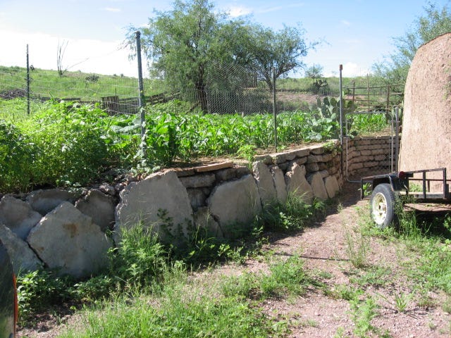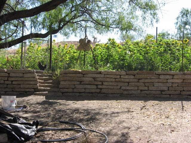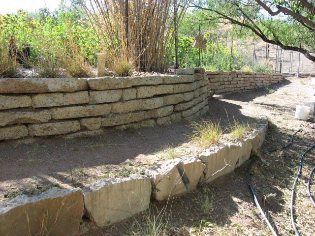 In the winter of 2001/2002 I built a rain water catchment at the mouth of one of those small watersheds using urbanite, which can be seen in the photo above and in the video link at the top. In an effort to take up some of the space required to fill in behind the retaining wall with soil, I tossed in a pile of scrap bamboo wood (used in constructing my house) and recent pruning’s from nearby native mesquite trees - perhaps several tons of woody material. This was filled in with soil, biocharred and mulched heavily.