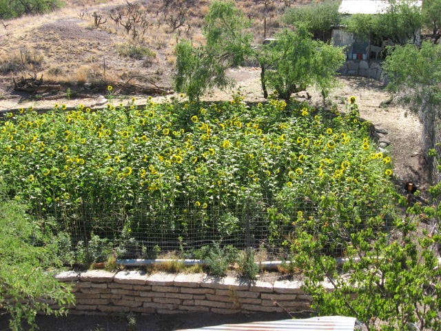 The traditional hill or mound system of hügelkultur was developed in an area where excess rainfall and moisture can keep garden soils too boggy. If you live on such a property, hilling, mounding or the use of raised beds is a fine way to provide a fertile habitat above boggy ground. However, here in the arid SW US, I prefer to use the traditional native American system of growing everything in lowered, sunken beds that also serve as rainwater catchments. This keeps plants below the worst of our drying spring winds while creating a low spot for our limited rainfall runoff to accumulate right around the plants.