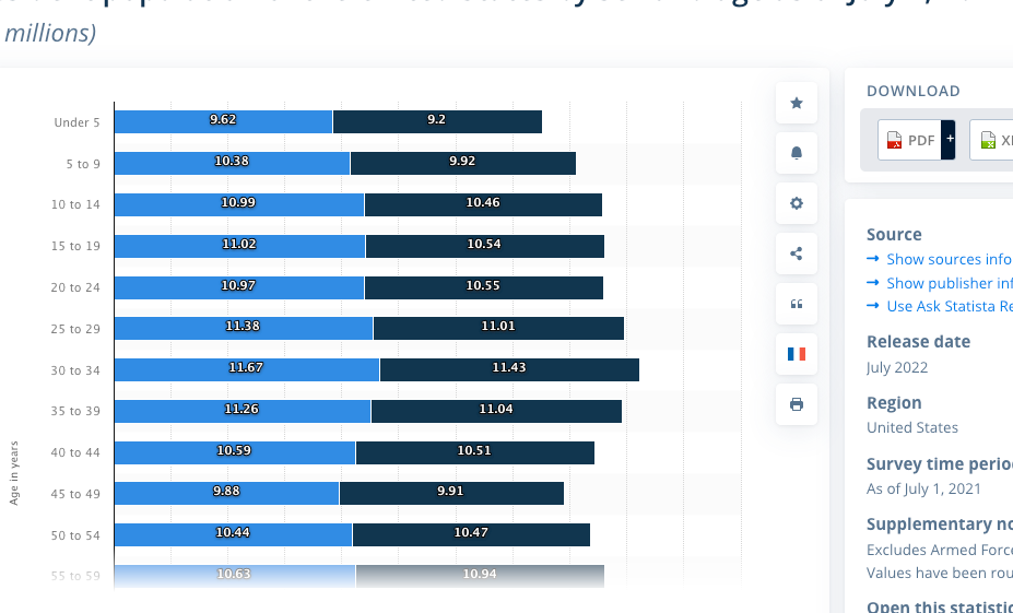 Below is a July, 2021 graph from Statista showing how that is occurring (blues is male, black female). Note that since the last 30 to 34 year old age group, ensuing age groups have become increasingly smaller. This will accelerate in the coming decades. Also, compare the 50 to 54 to the youngest group. That’s where we see verification of Shaw’s US birth gap.