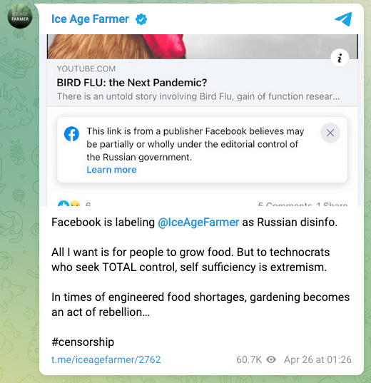 As you can see from this post by the Ice Age Farmer on Facebook (thanks to my nephew for sending that), if you exercise your right to free speech and begin to make connections between H5N1 (bird flu) and the possibility that the it might become the next pandemic, Facebook will defame you by calling you a Russian agent.