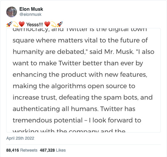 The Elon musk/Twitter thing is definitely a topic of discussion. I too have seen the comment he made and pondered what authentication of humans is going to be exactly. I’ve seen the interview on Joe Rogans podcast, and was wondering about Elon in general. I noticed that he took time to respond to questions, and seemed to chose his words carefully, while I also noticed that he chose to smoke marijuana on the show, knowing that this would generate lots of banter among people. Your perceptions of Elon seem to be similar to my own. He wasn’t on that podcast for financial reasons. He was on it for recognition. To be seen and known, and to convince the people watching that he’s a good guy. Here’s where I’m at now.
