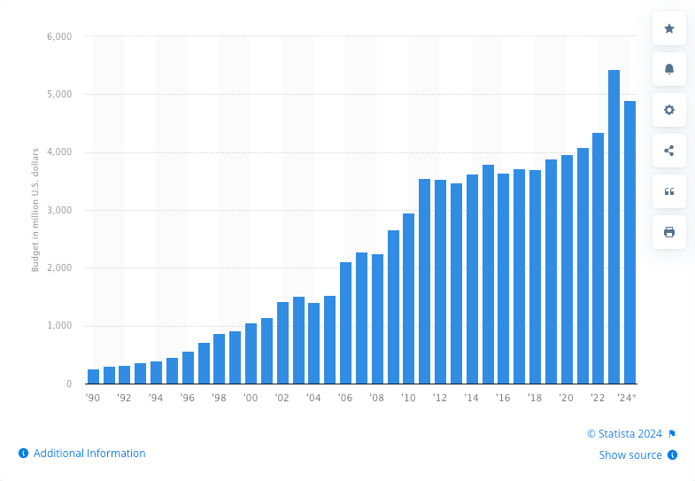The Border Patrol and the wall easily represent the largest portion of the border industrial complex. The following chart shows BP expenditures since 1990.