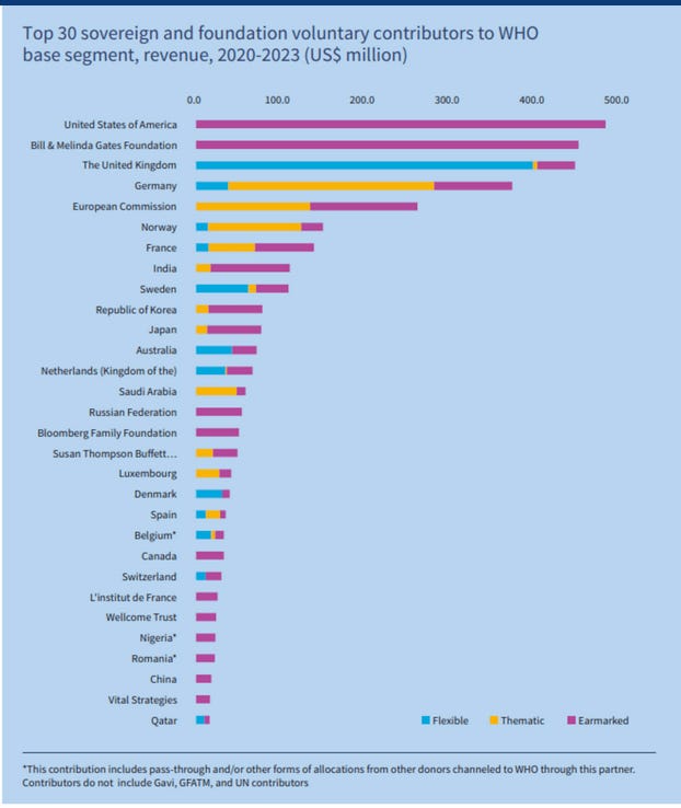 Good and bad - If trump keeps his word and if RFK Jr is able to do what he’s promised, then the medical industrial complex is where we could see some of the biggest changes. One positive outcome seems certain - because Trump pulled US funding from the WHO during his previous term, it seems safe to say he doesn’t need RFK’s advise to do so again. Some of you will recall that when Trump pulled US funding from the WHO, that left Bill Gates, who was then the second largest funder of the WHO, as the largest funder of the WHO. As most of you also know, one of the first things Biden did when he got into office was restore funding to the WHO. As this recent chart from the WHO shows, Bill Gates is still the second largest funder of the WHO.